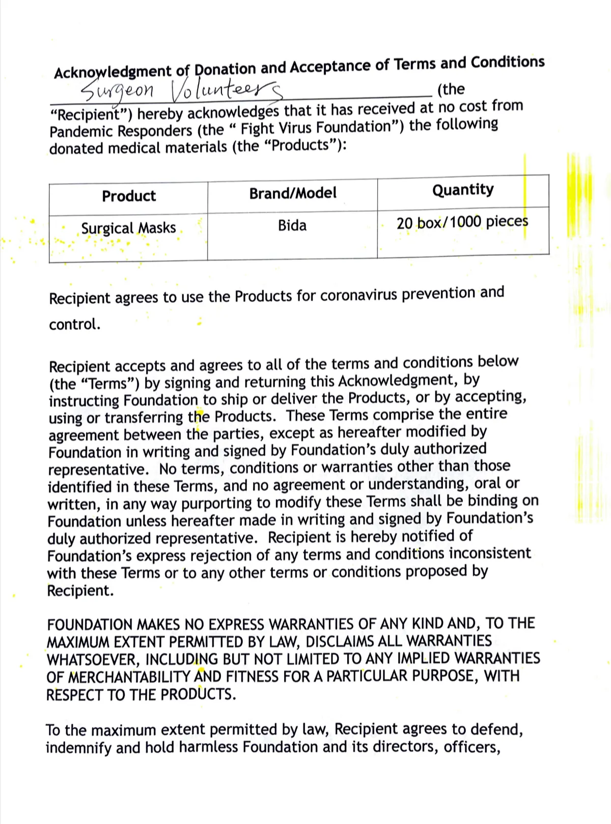 March 2,2021,Pandemic Responders donates 1000 Medical Surgery Masks to Heidi through Surgeon Volunteers. The surgeon Volunteers serviced Heidi in past 10 years.